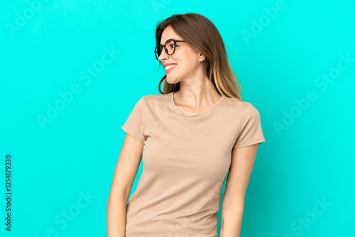 Young caucasian woman isolated on blue background looking side