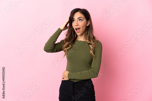 Young caucasian woman isolated on pink background has realized something and intending the solution