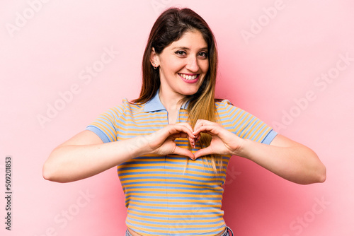 Young caucasian woman isolated on pink background smiling and showing a heart shape with hands.