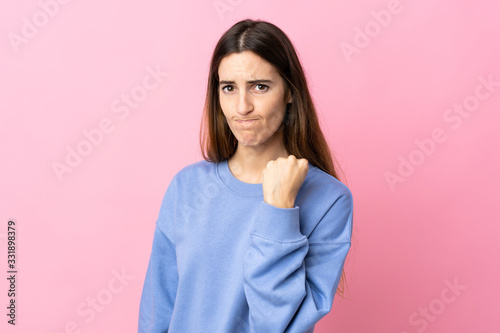 Young caucasian woman isolated on pink background with unhappy expression