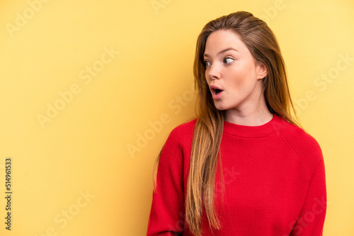 Young caucasian woman isolated on yellow background being shocked because of something she has seen.