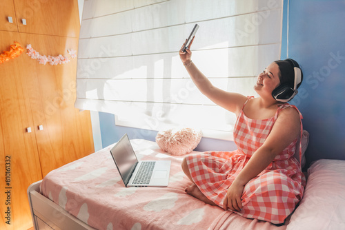 young caucasian woman lying in bed making a video call and waving with the laptop