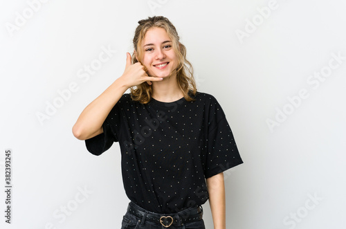 Young caucasian woman on white backrgound showing a mobile phone call gesture with fingers.