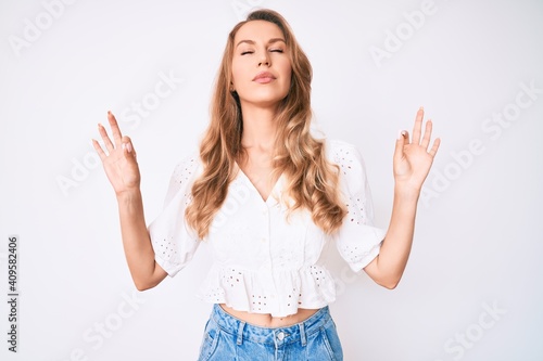 Young caucasian woman with blond hair wearing casual summer clothes relax and smiling with eyes closed doing meditation gesture with fingers. yoga concept.