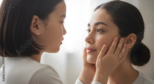 Young Child Touching Mother’s Face Tenderly in a Minimalist Room with Soft Natural Light
