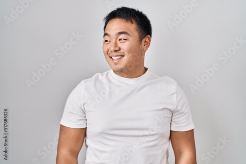 Young chinese man standing over white background looking away to side with smile on face, natural expression. laughing confident.