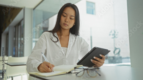 Young chinese woman working indoors at an office, writing in a notebook and using a tablet, showcasing a professional and focused atmosphere.
