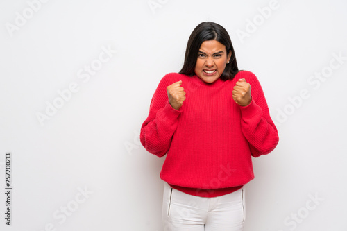 Young Colombian girl with red sweater frustrated by a bad situation