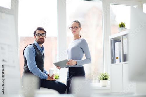 Young confident office workers looking at camera while organizing work by window