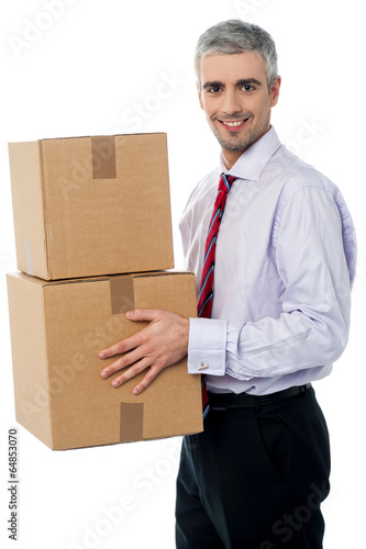Young corporate man holding card box