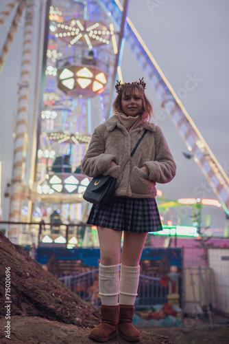 young cosplay woman on fun fare and Ferris wheel with magic winter lights
