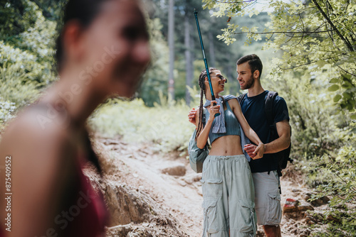 Young couple enjoying a hike in the forest, sharing smiles and bonding on a sunny day. Perfect for outdoor adventure and nature enthusiasts.