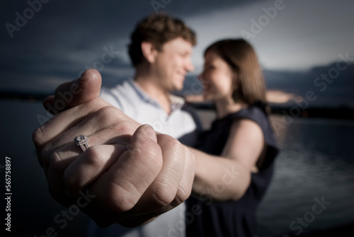 Young couple enjoying the sunset and each others' company at Sloan's Lake in Denver, Colorado.