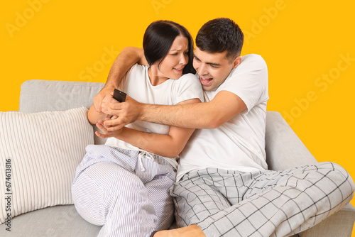 Young couple fighting for TV remote control while sitting on sofa against yellow background
