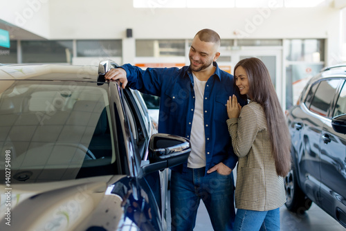 Young couple happily checking out vehicle in dealership showroom, millennial man inspecting car closely, woman happily leaning on his shoulder, family buying new auto together