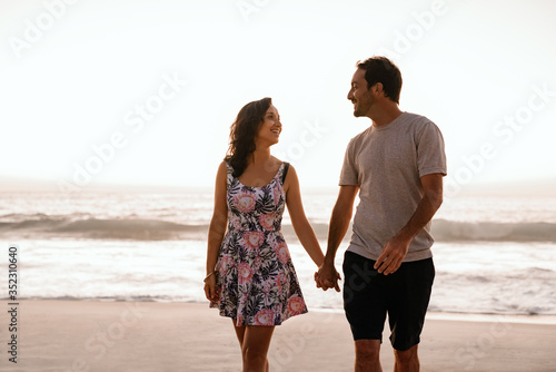 Young couple holding hands and walking along a sandy beach