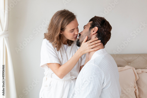 Young couple in a relationship kissing and cuddling. Happy couple hug and kiss on the bed near the window in the morning. Sensual young couple kissing on bed at home.