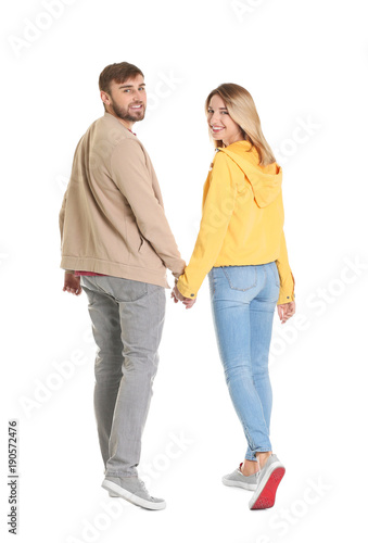 Young couple in casual clothes walking on white background