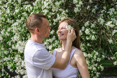 Young Couple in Love Hugging in Spring Garden with White Blossoming Trees on Floral Background.