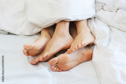 Young couple making sex under blanket in bedroom. Sleeping spouses in their bed.