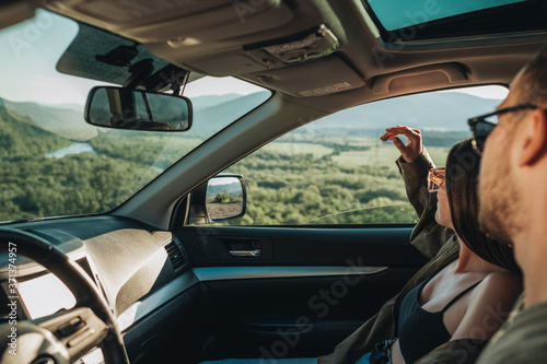 Young Couple on a Road Trip, Man Diving Car with Woman Sitting on Passenger Seat