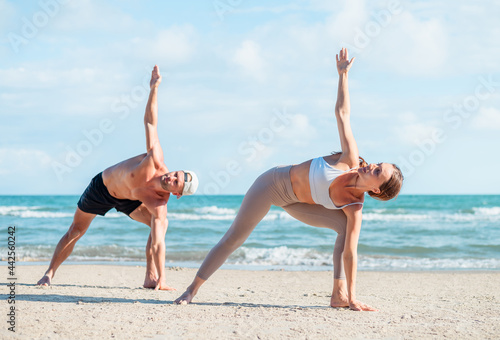 Young couple practicing yoga on beach at sunrise or morning