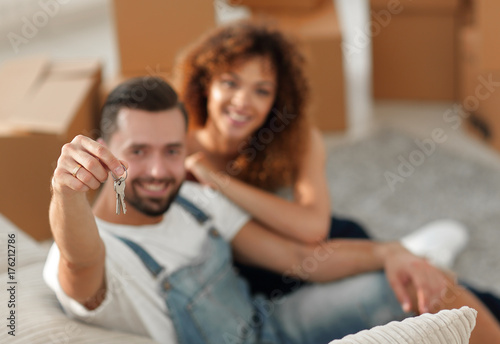 Young couple with a key to a new apartment.