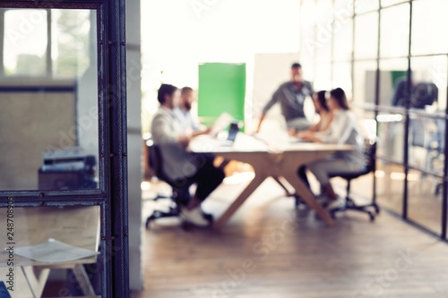 Young creative people in modern office. Group of young business people are working together with laptop, tablet, smart phone, notebook. Successful hipster team in coworking. Freelancers.