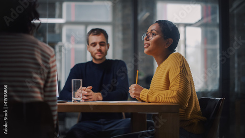 Young Creative Team Meeting with Business Partners in Conference Room Behind Glass Walls in Agency. Colleagues Sit Behind Conference Table and Discuss Business Opportunities, Growth and Development.