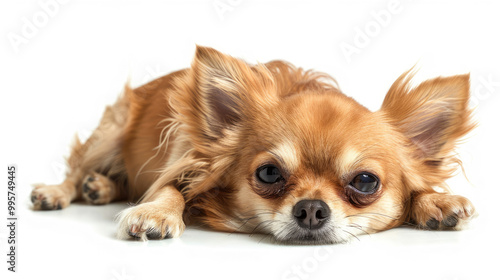 Young Cute Chihuahua Puppy Sitting and Lying Down While Looking Forward on White Background