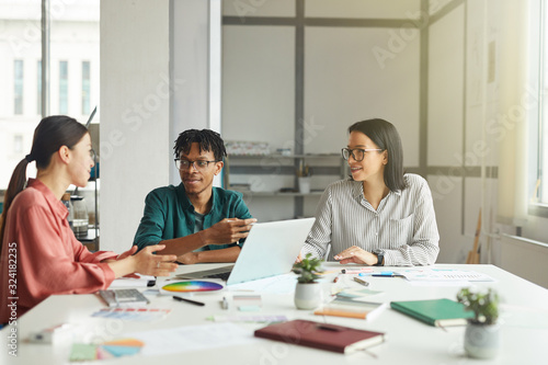 Young designers discussing presentation in team while working at the table with laptop and pattern at office