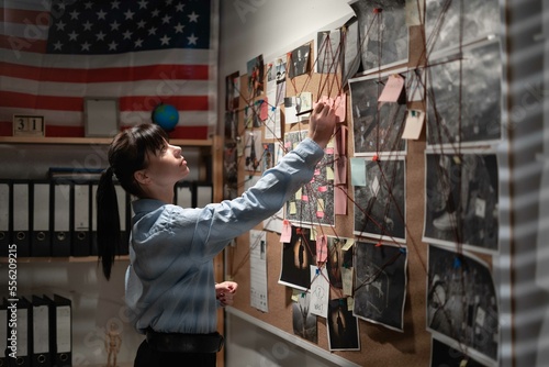Young Detective looking at investigation board, searching for solution.