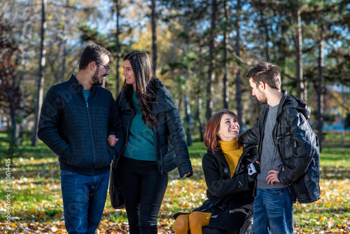 Young disabled woman in a wheelchair with her boyfriend and friends in a park. Two couples