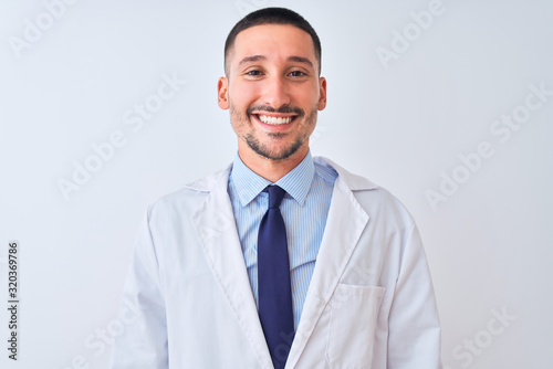 Young doctor man wearing white coat over isolated background with a happy and cool smile on face. Lucky person.