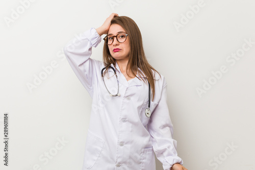 Young doctor woman against a white wall being shocked, she has remembered important meeting.