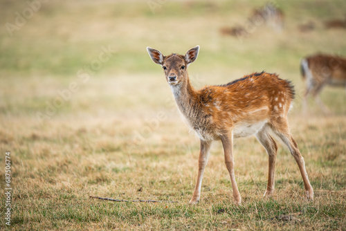 Young fallow deer standing, looking into camera