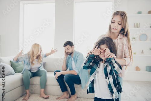 Young family two children avoid listening parents quarrel tired hear yelling