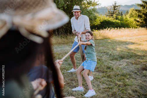 Young family with happy kids having fun together outdoors pulling rope in summer nature.