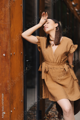 Young fashion girl dressed in a summer dress with a wicker wide hat walks and poses in the old city. Street fashion portrait of young beautiful woman walking in the city