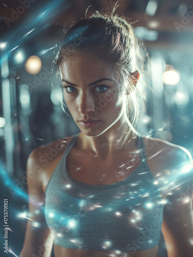 Young Female Athlete with Sweat and Focus, Staring Directly Ahead in a Dimly Lit Gym, Enhanced with Dynamic Blue Light Streaks and Sparkling Particles Symbolizing Power, Energy, and Fitness Motivation