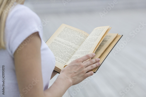 Young female hand holding an old book - reading outdoors