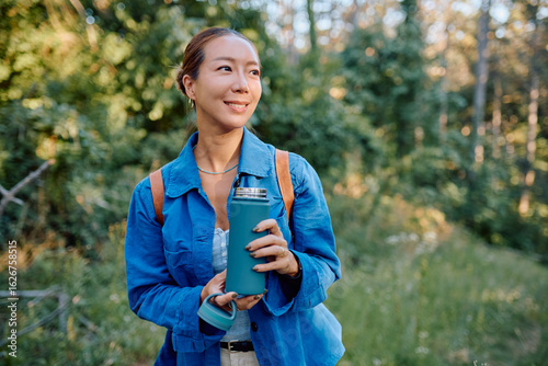 Young female hiker is holding a reusable water bottle while enjoying fresh air in the forest during summer hike