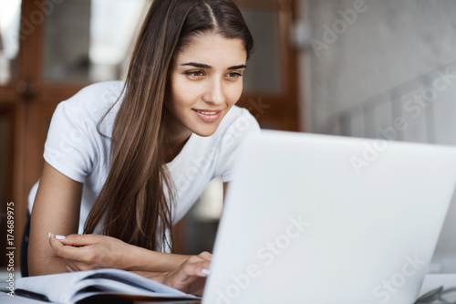 Young female law student using a laptop in public library looking positive smiling. Studying is so much fun. Education concept.