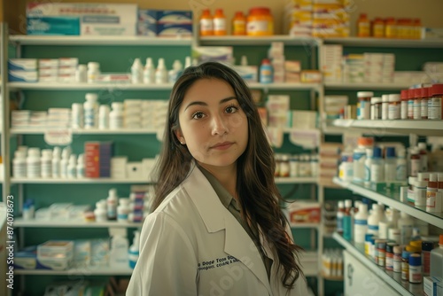 Young female pharmacist standing confidently in a well-stocked pharmacy. Professional in white coat surrounded by medicine shelves. Healthcare industry concept. Generative AI
