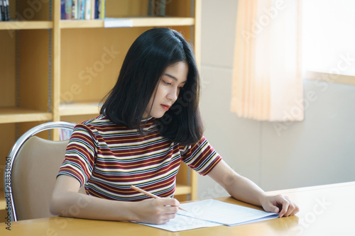 Young female university student concentrate doing language practice examination inside library. Girl student writes the exercise of the examinations. University examination and education concept.