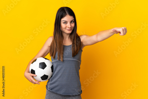 Young football player woman isolated on yellow background giving a thumbs up gesture