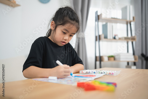 Young Girl Engaged in Creative Drawing Activity at Home with Colorful Markers and Paper in Bright, Cozy Indoor Environment