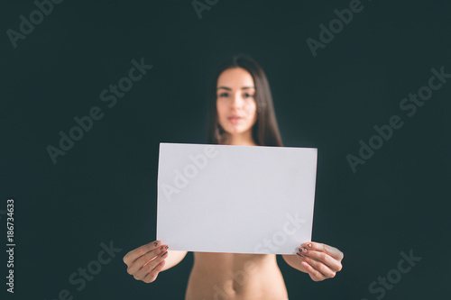 young girl holding an empty banner. Young woman with long black hair stands isolated on black background. The girl has a sports figure, she is dressed in white underwear. Beautiful panties and bra.