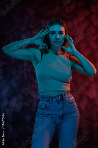 Young girl posing and moving in a black studio with colored light