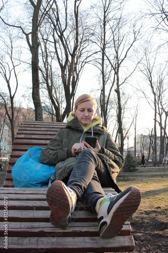 Young girl resting on a bench in a city park on the nature. Woman looking into smartphone